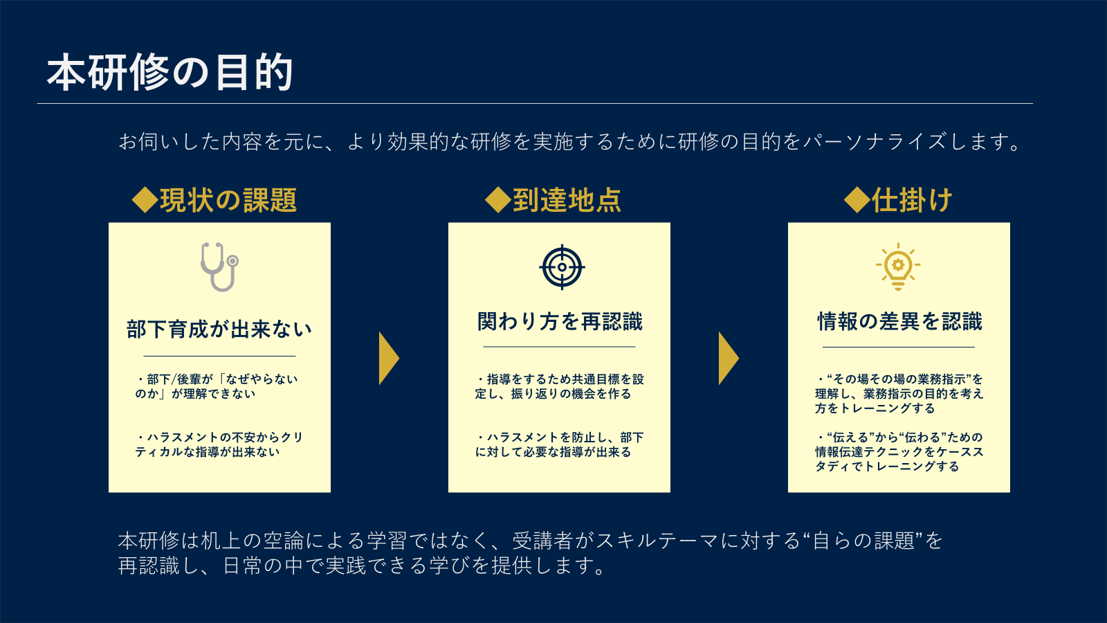提案資料の弱さ、研修メニューの整理不足、顧客課題に合わせた提案ストーリーの欠如により、エージェント提案・クロスセル・リピートにつながる仕組みが構築されていない事がほとんどです。