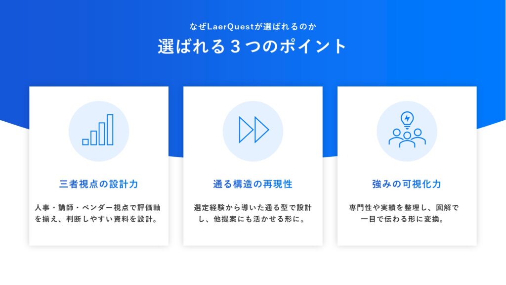 講師の経験や専門性を、人事が比較・判断しやすい構造に整理。内容を盛らずに強みを可視化することで、クライアントの決済を妨げる「他との違いが分からない」状態を防ぎ、選ばれる理由を明確にします。