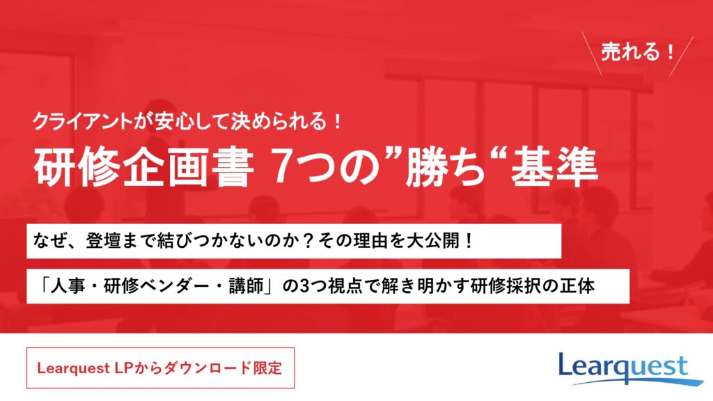 時に講師はクライアントに研修企画書を説明すると思います。ただ、クライアントにあなたの有意性を伝えられるベンダー営業は多くありません。そのため、あなたの企画書の持ち味をすぐに伝えられる魔法のカンペも提供します。